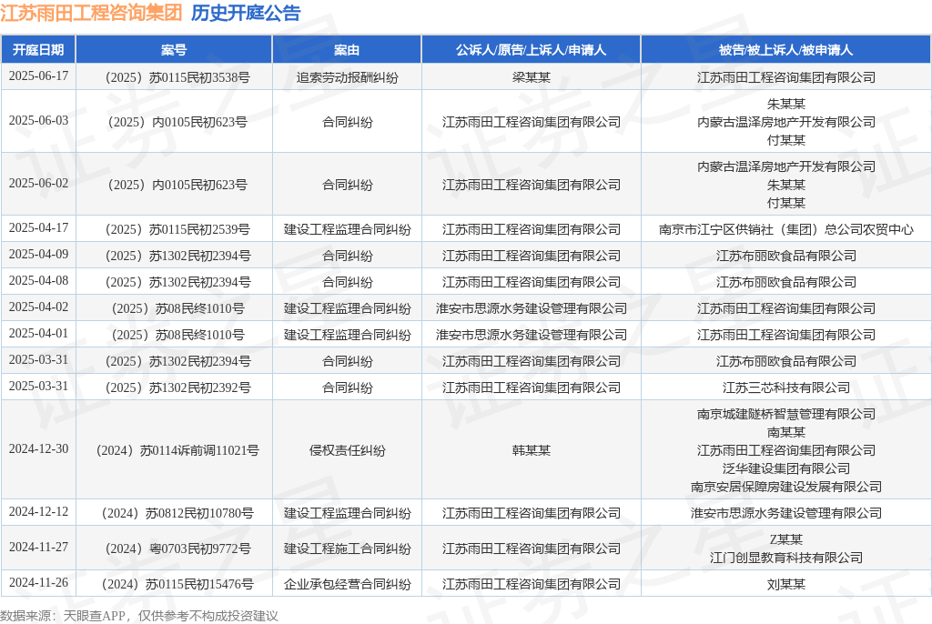 本站消息,根据天眼查APP显示,近日公布了一则江苏雨田工程咨询集团有限公司作为被告/被上诉人的开庭公告,详细内容如下:
